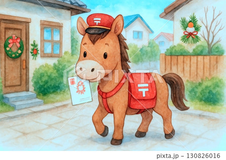 年賀状を届ける馬の郵便屋さんキャラ(水彩)