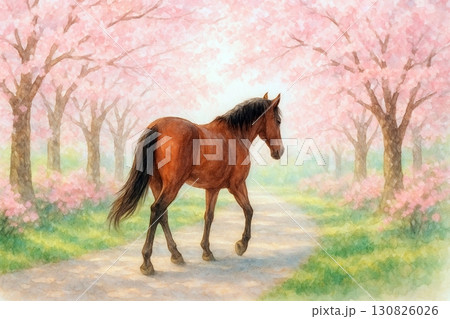 桜並木の中を歩く馬の春らしい後ろ姿(水彩)