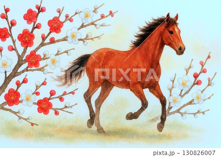 梅の花咲く春に駆ける馬の水彩イラスト
