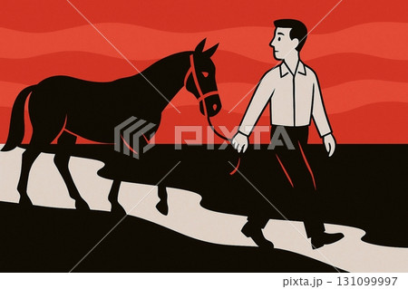 レトロアート風 馬と歩く男性
