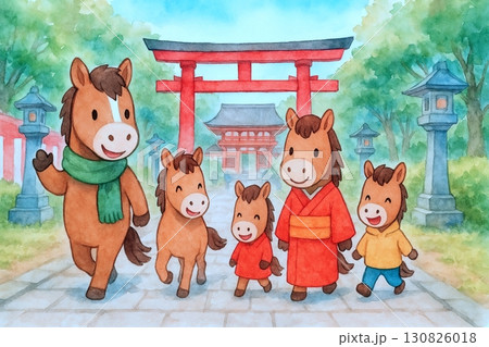 馬の家族が神社へ初詣する干支イラスト(水彩)
