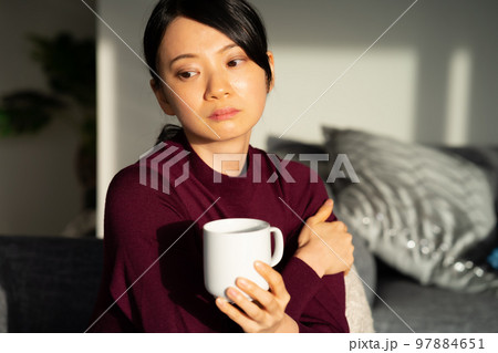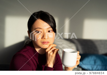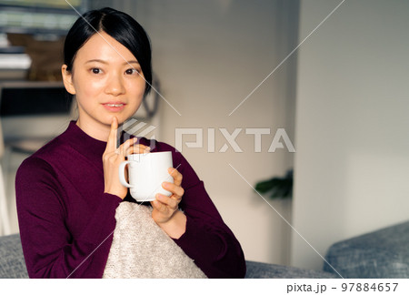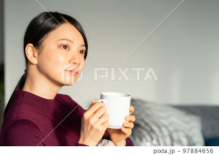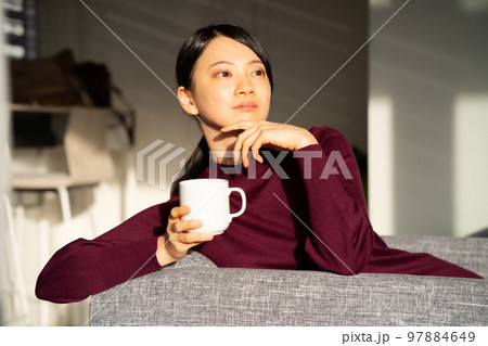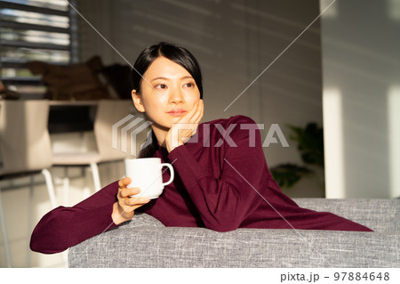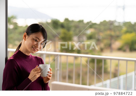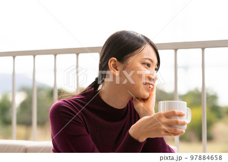 テラスのソファでコーヒーを飲んでくつろいでいる女性