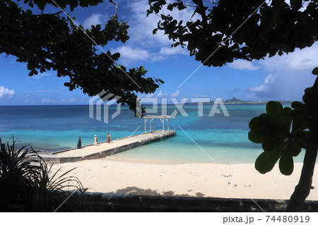 沖縄県本部町備瀬海岸から見るエメラルドグリーン青い海の伊江島