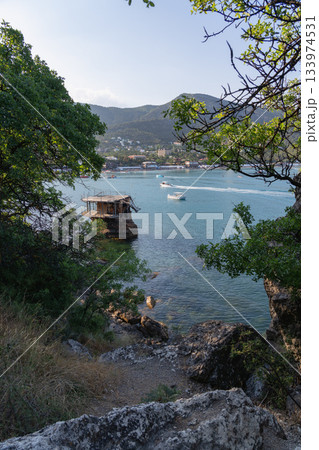 Stone path among mountains and greenery overlooking the calm bay of Novy Svet, Crimea
