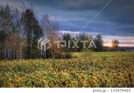Autumn sunflower field with a birch grove and a dramatic sunset