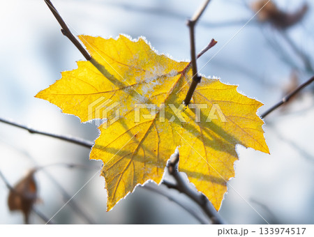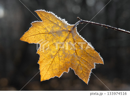Close-up of a daisy flower covered with ice crystals and hoarfrost. First frost, late autumn, or early winter