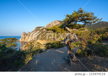 Twisted juniper on the Golitsyn Trail with a view of the sea and the cliffs of Novy Svet, Crimea