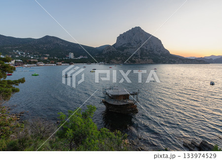 Sunrise over the bay of Novy Svet with a view of the mountain and boats on the water