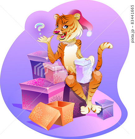 A cartoon tiger sits on gift boxes. Happy New Year and Merry Christmas. The tiger is a symbol of the new year.