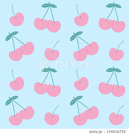 ライトブルーの背景とハート型のピンクのサクランボのパターン