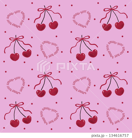 赤いリボンがついたハート型の真っ赤なサクランボとドットのパターン