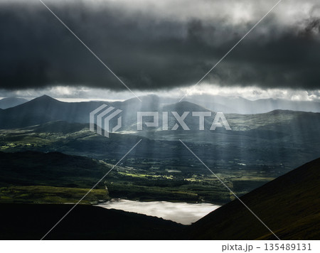 This is a picturesque view in Killarney National Park in Ireland. Sunlight breaks through the dark, stormy sky, illuminating the rolling green hills and valley below to create a breathtaking scene.