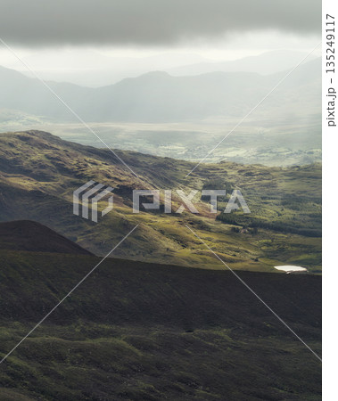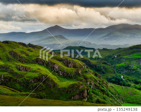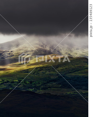 This is a stunning view of the rugged mountain peaks of Ireland. Dark storm clouds loom overhead, while patches of sunlight illuminate the lush green valleys below.