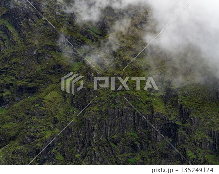 Lush green mountain face disappearing into the low-hanging clouds conveys a sense of mystery and the raw beauty of the wilderness.