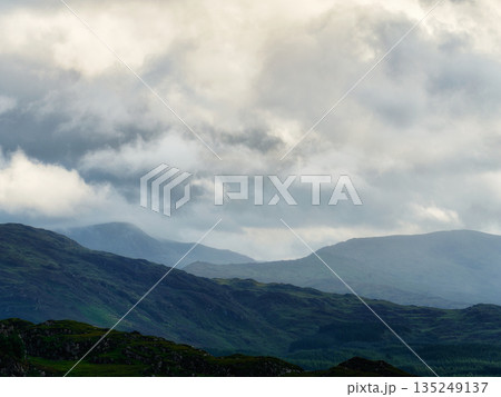 The dark green mountains are shrouded in mist and rain. Streaks of sunlight break through the clouds and illuminate sections of the landscape.