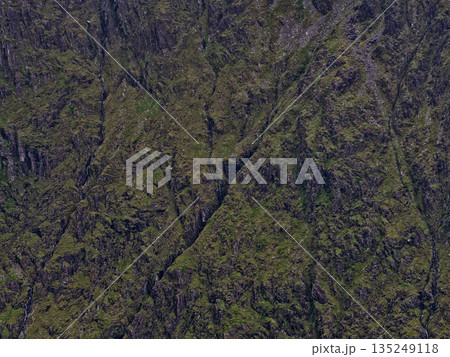 Mountain texture displaying rough terrain, small streams, and uneven growth. Ideal for outdoor and nature concepts.