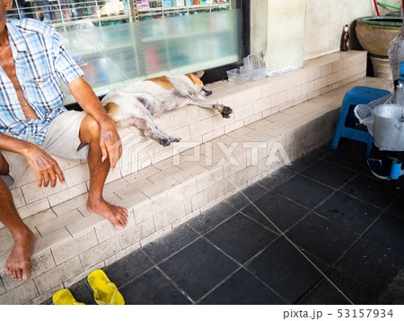 Dog sleeping with man beside the shop,Bangkok,Thai
