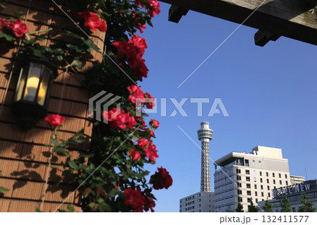 山下公園の未来のバラ園のバラととマリンタワー