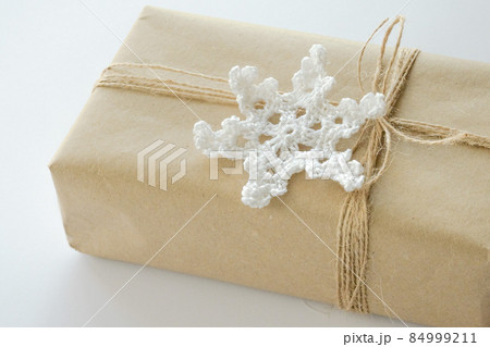 Christmas and New Year background. Gift box wrapped in kraft paper with jute cord. Decorated with a crocheted snowflake