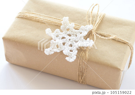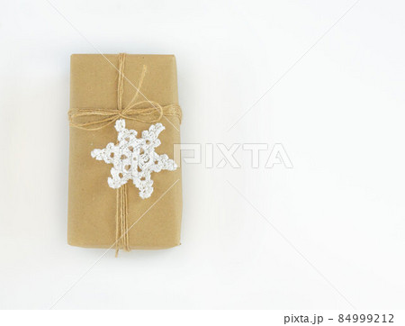 Christmas and New Years flatlay background. Gift box wrapped in kraft paper with jute cord. Decorated with a crocheted snowflake. Place for your text
