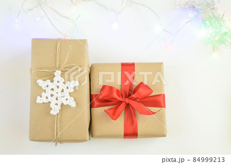 Christmas and New Year background with garland. Gift box wrapped in kraft paper with jute cord. Decorated with a crocheted snowflake. Box with a red ribbon