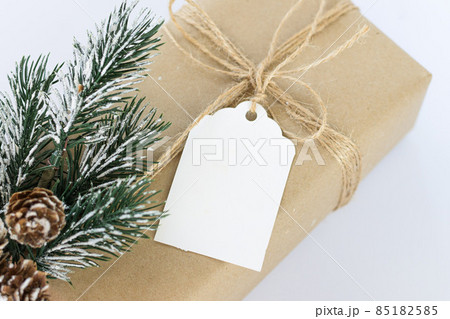 Close up of vintage craft gift with rope and blank label isolated on white background. Spruce branch, garland, christmas gift