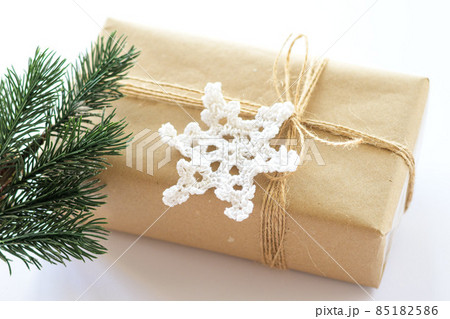 Christmas and New Years background close-up. Gift box wrapped in kraft paper with jute cord. Decorated with a crocheted snowflake and a branch