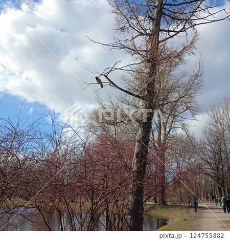 Scenic view of tall bare tree in park with cloudy blue sky, people walking on path, body of water, and diverse trees in background. Tranquil natural setting