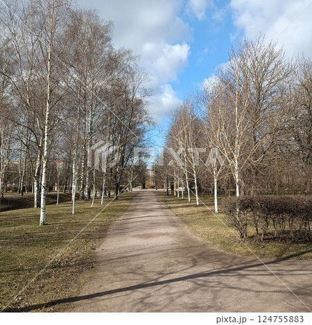 Serenity of a winding dirt path through a birch tree grove. White bark contrasts with brown branches, ground covered in leaves under blue sky