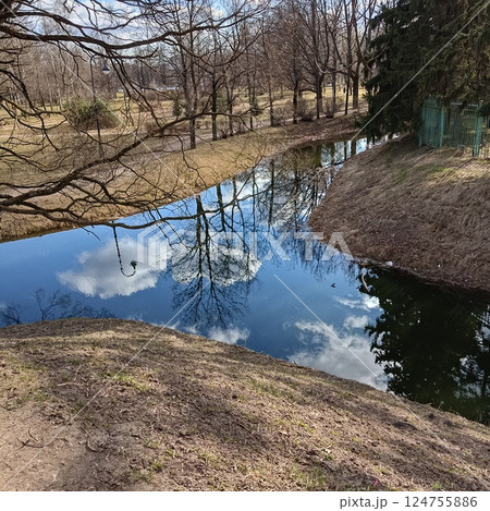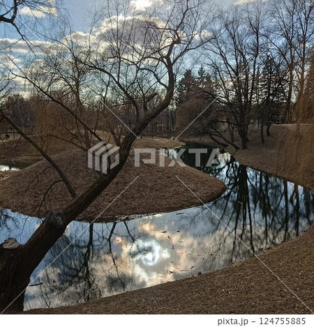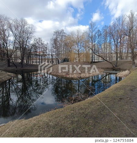 Tranquil pond reflecting surrounding scenery and cloudy sky in a serene landscape. Bare trees, dry grass, and urban buildings in background under a peaceful blue sky