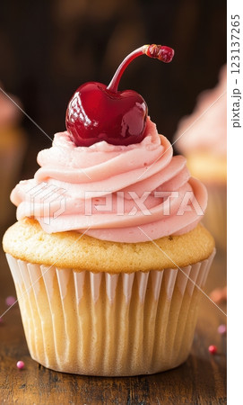 Vanilla cupcake with pink frosting, glossy red cherry, and colorful sprinkles on rustic wooden surface, soft natural lighting highlighting fluffy texture and golden cake, blurred background with more