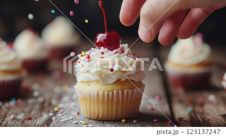 Hand reaching for vanilla cupcake with pink frosting and glossy red cherry, sprinkles falling mid-air in soft natural light, cupcake on rustic wooden surface with blurred background of more cupcakes,
