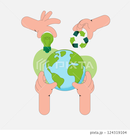 Human hand holding Earth Globe, recycling symbol and Light Bulb. The concept of sustainable development for business, ecology and environment protection. Flat vector illustration.