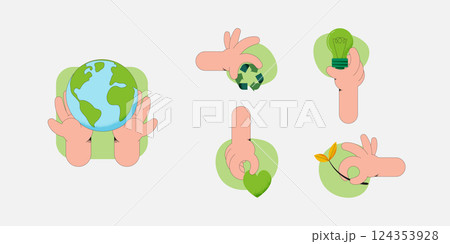 Set of Hand Holding green earth. Eco friendly icons. Sustainability, ecology and environment Development concept. Vector Illustration.