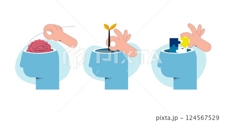 Mental health concept, psychological problem. Human head with jigsaw, plants, brain confused. Flat Vector illustration.