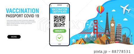 Banner with popular world landmarks and International Digital vaccine certificate for free movement and travel. Smartphone with Qr code test result. Covid-19 immune passport app.