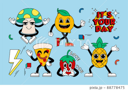 Retro cartoon stickers with funny comic characters, gloved hands. Contemporary illustration of comic hearts, sausage, toaster, banana, flower, kiss lips, toasts, hugs, love