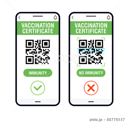Covid-19 immune passport app. International Digital vaccine certificate with positive and negative results for free movement and travel. Two smartphone with Qr code test results