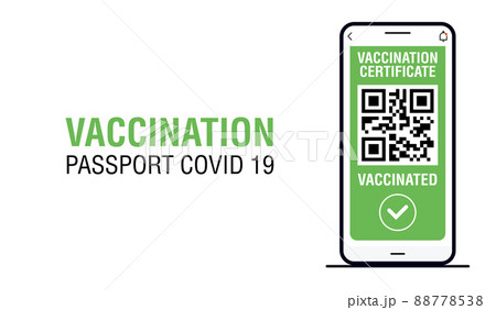 Banner with International Digital vaccine certificate for free movement and travel. Smartphone with Qr code test result. Covid-19 immune passport app.