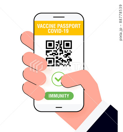 Covid-19 immune passport app. International Digital vaccine certificate for free movement and travel. Smartphone with Qr code test result in hand