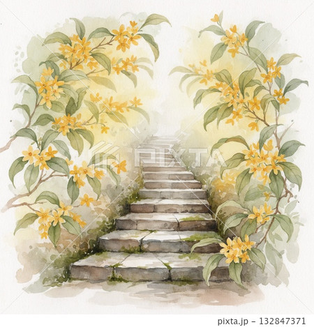 イラスト風 銀杏並木道 秋の公園で散歩する女性
