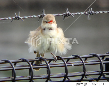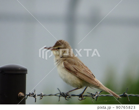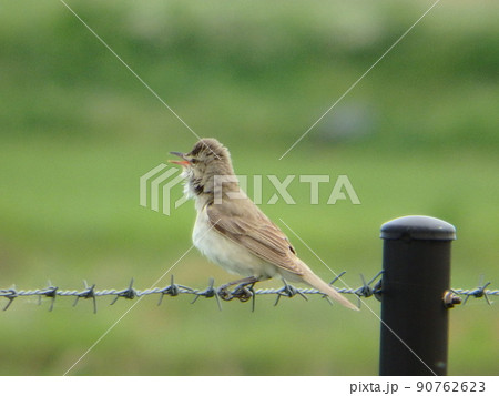 フェンスに掴まりさえずりをしているオオヨシキリ