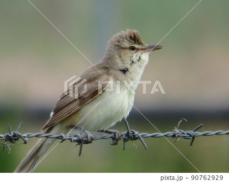 鉄線に肢でしっかりつかまっているオオヨシキリ