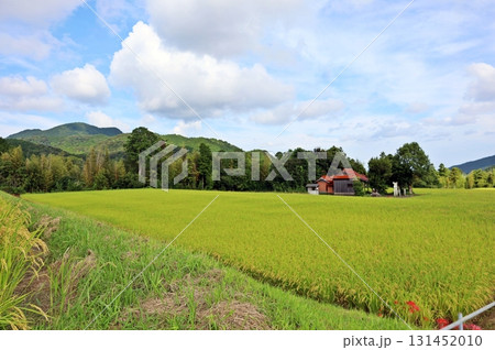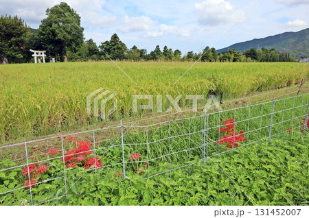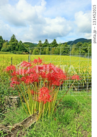 木々と稲作の手前に咲いている曼殊沙華(彼岸花)