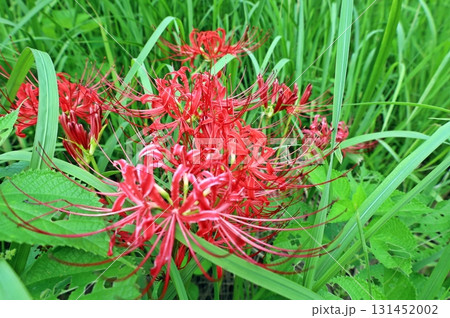 緑の草原に咲き誇る曼殊沙華(彼岸花)