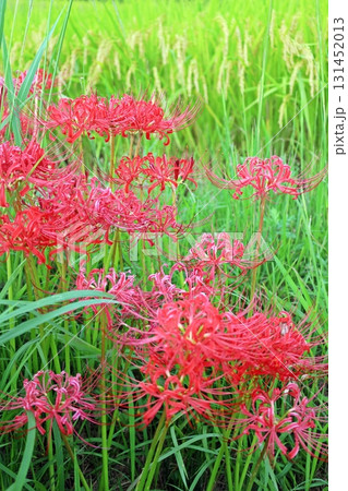 稲作の手前にぽつぽつと咲く曼殊沙華(彼岸花)