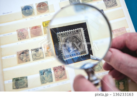 A close-up view of an old Canadian stamp through the lens of a magnifying glass, part of a collection book