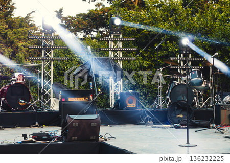 An empty concert stage with musical equipment, guitar amps, illuminated with moving spotlights, in a public park in the daytime