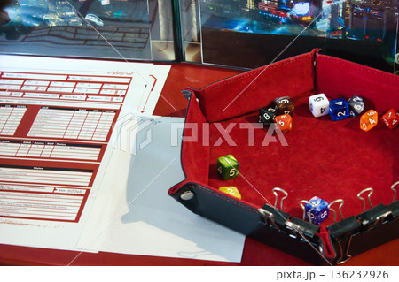 A variety of different colored dice in a leather rolling tray, with paper character sheets in preparation for an RPG role playing game
