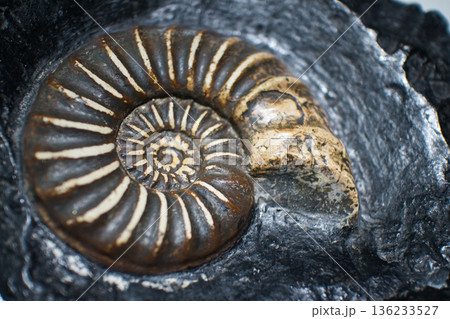 Close-up shot of a spiral ammonite (Pleuroceras solare) fossil set in stone as part of a palaeontology exhibit at a natural history museum